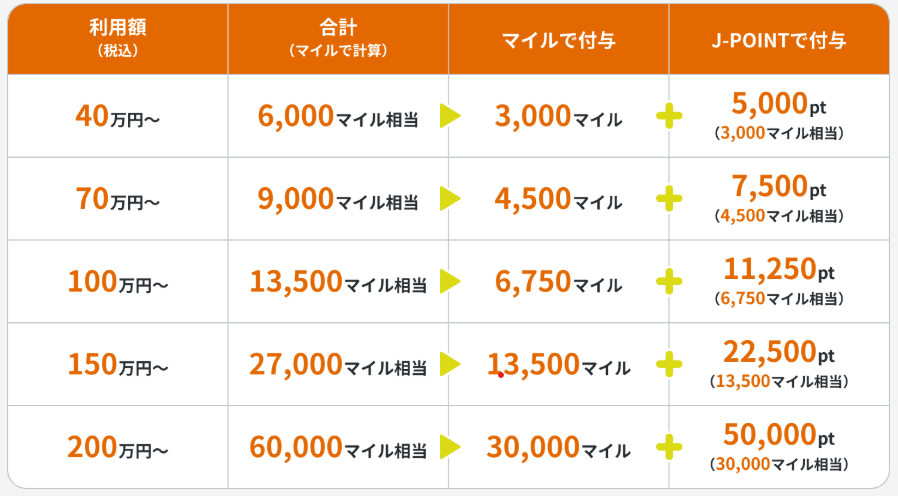 | JCB特典1 | 60,000マイル | 60,000マイル |